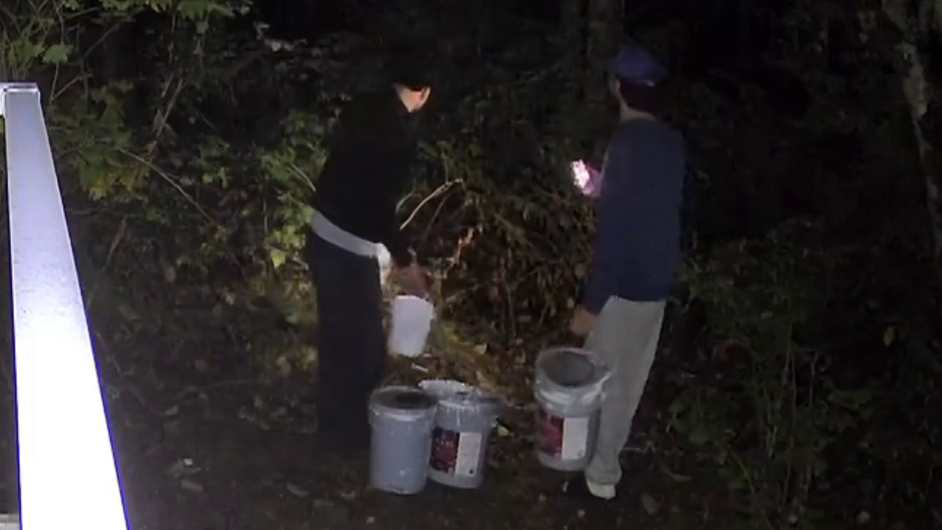 A resident captured security footage of the men polluting the waterway, which flows through Port Moody and Coquitlam and contains a fish hatchery.