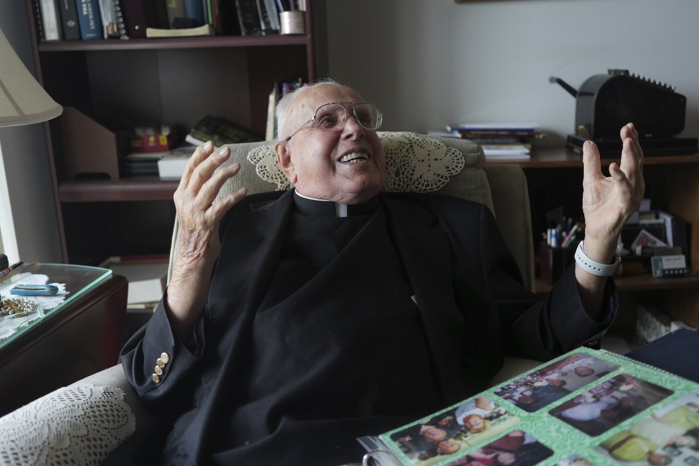 Sitting in his room, Kelly flips through a photo album detailing his journey. He smiles with every page turn, pointing to black-and-white photos of him as a toddler and milestones as a Catholic — his baptism, confirmation and ordination as a priest.