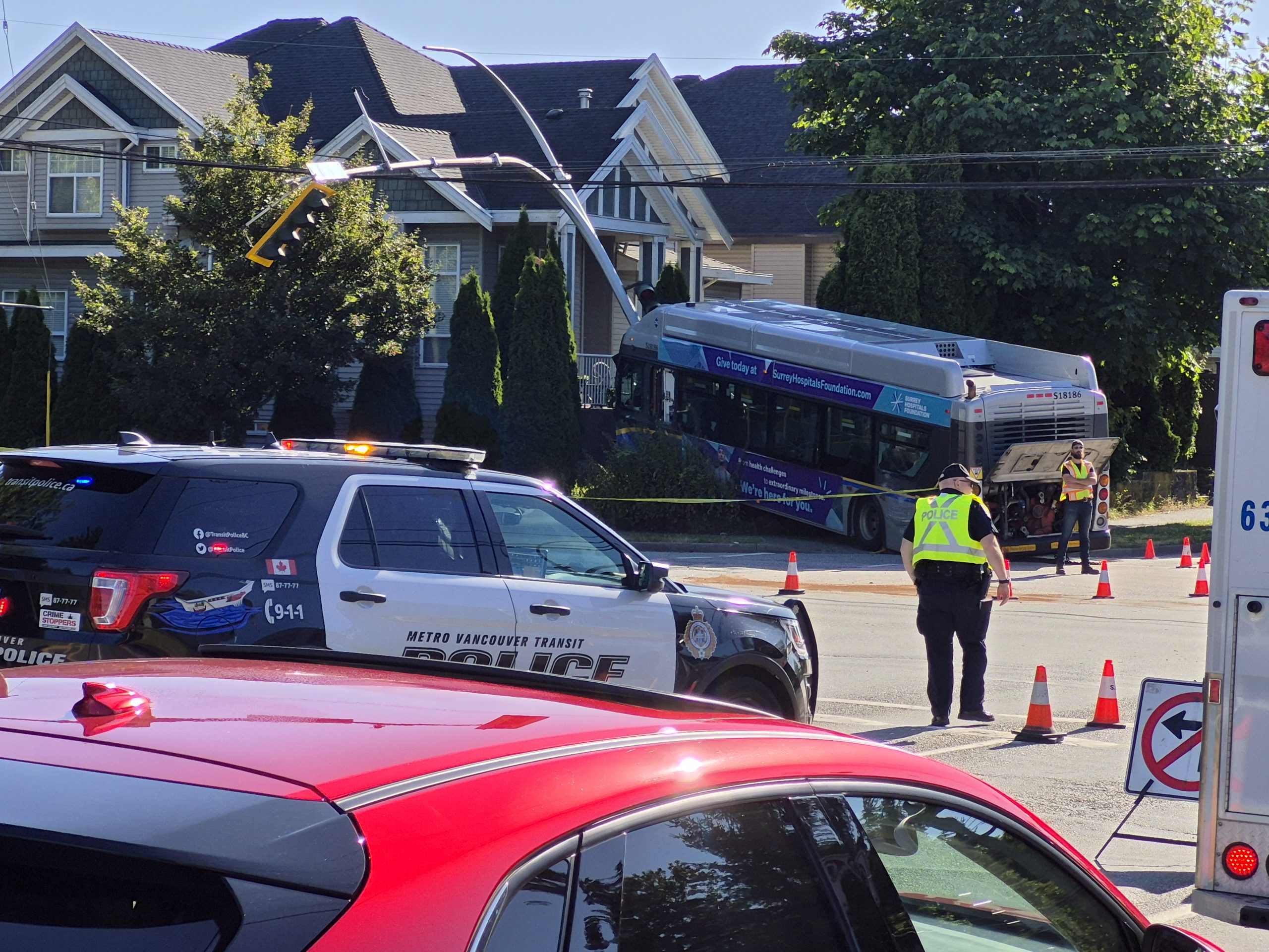 A two-vehicle collision involving a TransLink bus partially shut down the intersection of 88th Avenue and 132nd Street in Surrey for several hours on Tuesday morning.