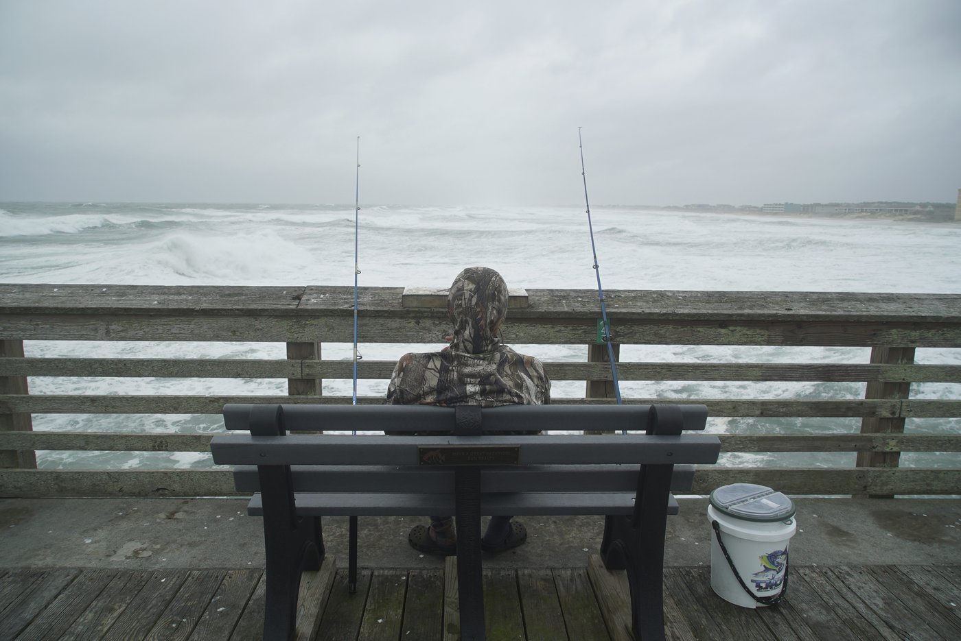 On Jennette’s Pier in Nags Head, where sustained winds reached 45 mph (72 kph) early Thursday, dozens who rode out the storm were taking photos of the huge waves crashing into the structure amid the driving rain.