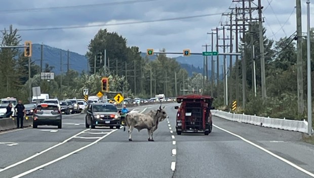 The highway had closed for more than an hour as emergency crews worked to remove a bull — who is unhurt — off the roadway, the Abbotsford Police Department said.