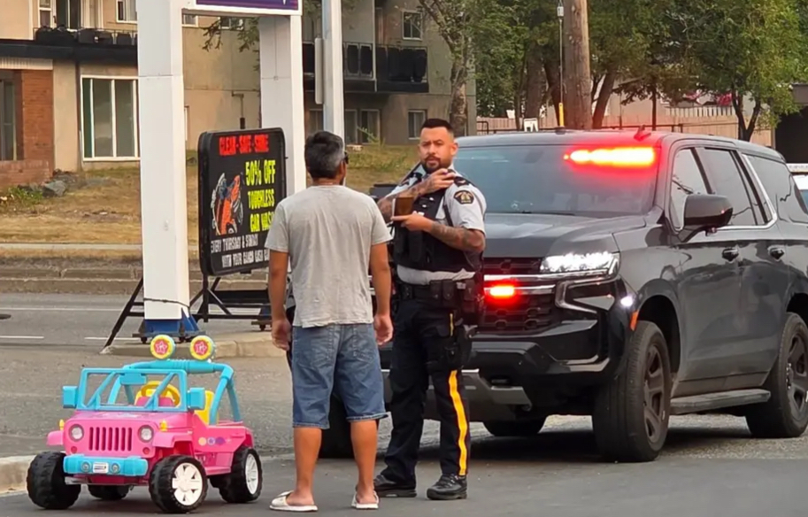 The Prince George RCMP says an officer conducted the unusual traffic stop on 15th Avenue near Nicholson Street around 9 a.m.