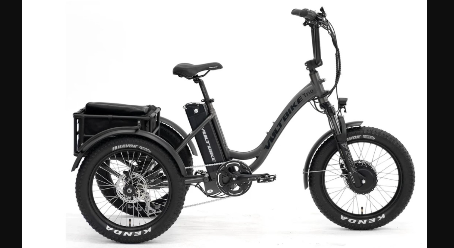 The bike is a black Volt Trio Trike with a car seat on the back.