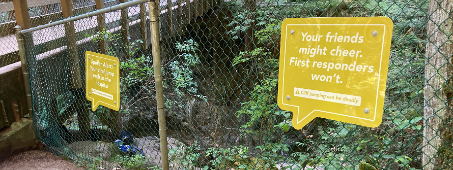 The District of North Vancouver has put up “bold new signs” in Lynn Canyon Park, hoping to discourage dangerous cliff jumping.