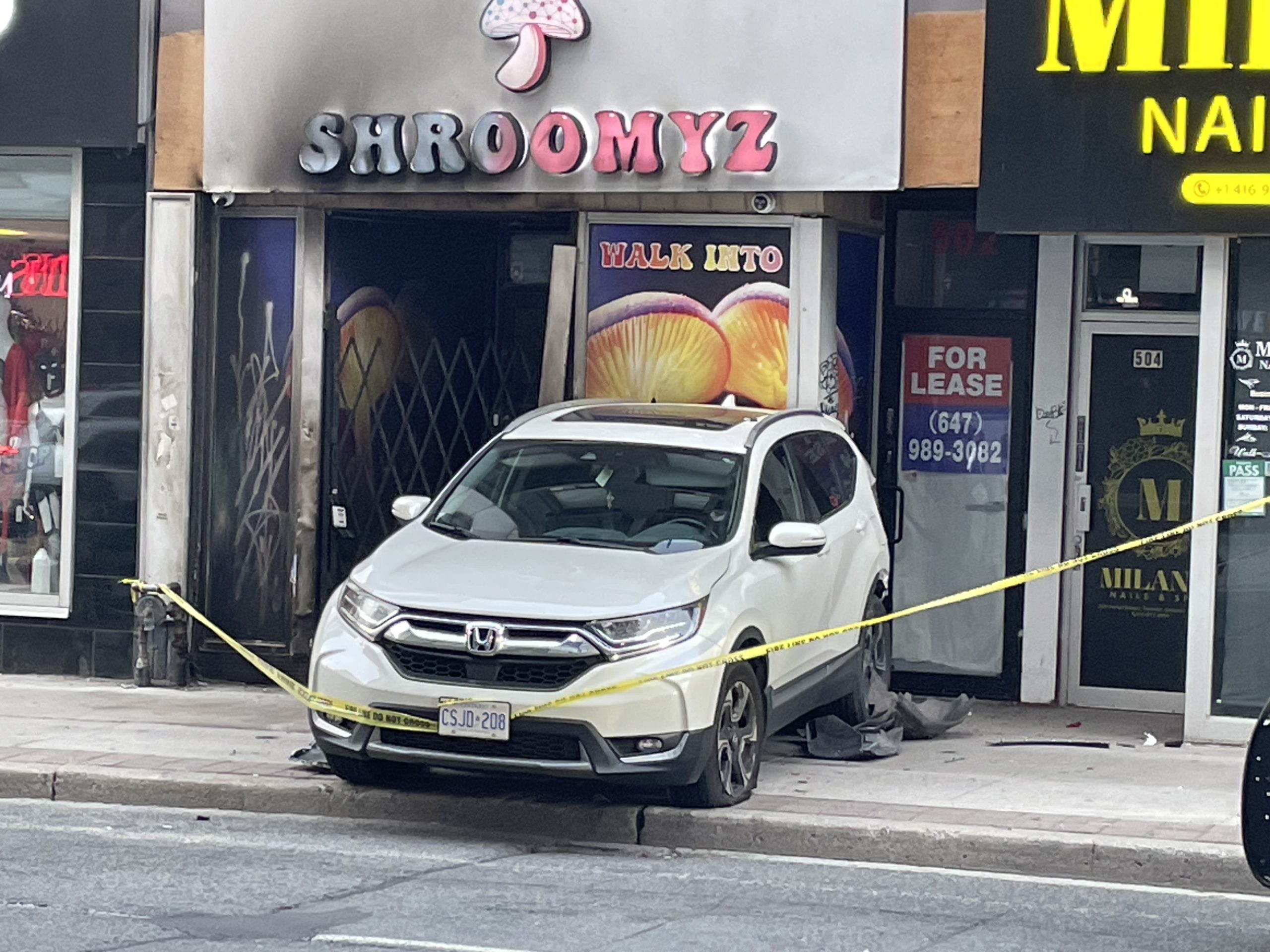Toronto police say a vehicle slammed into the storefront of Shroomyz, a downtown magic mushroom dispensary, early Monday morning in what authorities are now investigating as a hit-and-run.