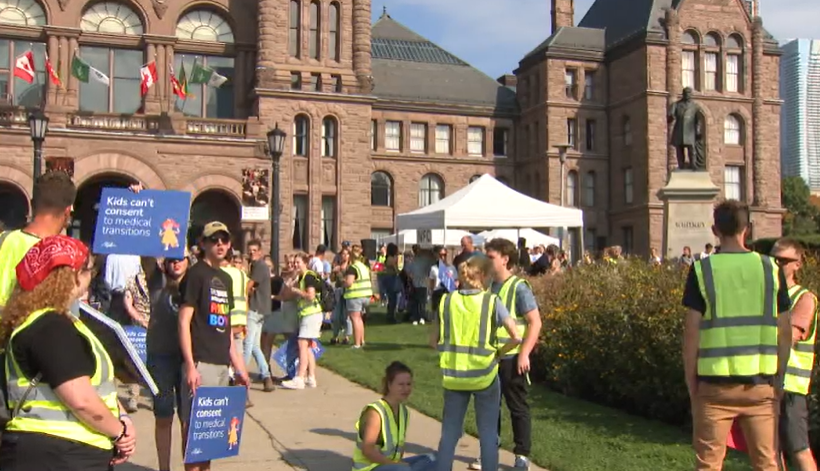 Protesters gathered at Queen’s Park on Saturday for duelling demonstrations focused on Canada’s policies regarding gender-affirming care for transgender youth.