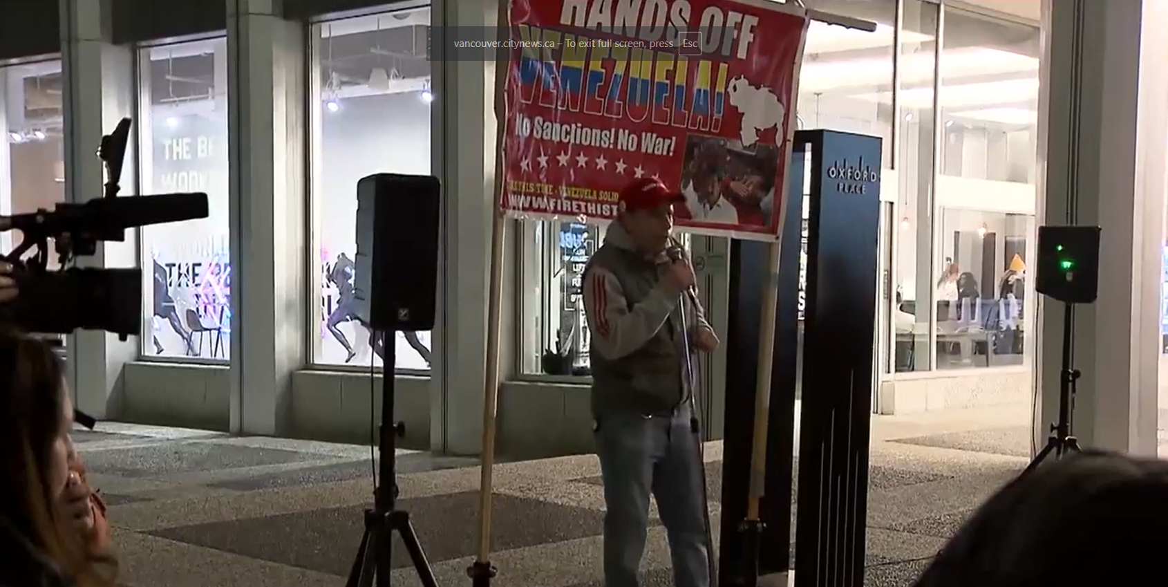 Dozens of protesters have gathered outside the U.S. consulate in downtown Vancouver, calling on the U.S. to end its war on Venezuela and to repatriate Venezuelan President Maduro and his wife, Celia Flores.