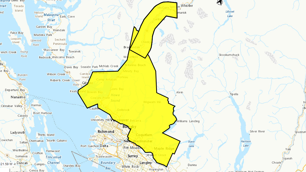 The warning also covers Howe Sound and the Sea to Sky Highway between Squamish and Brandywine.