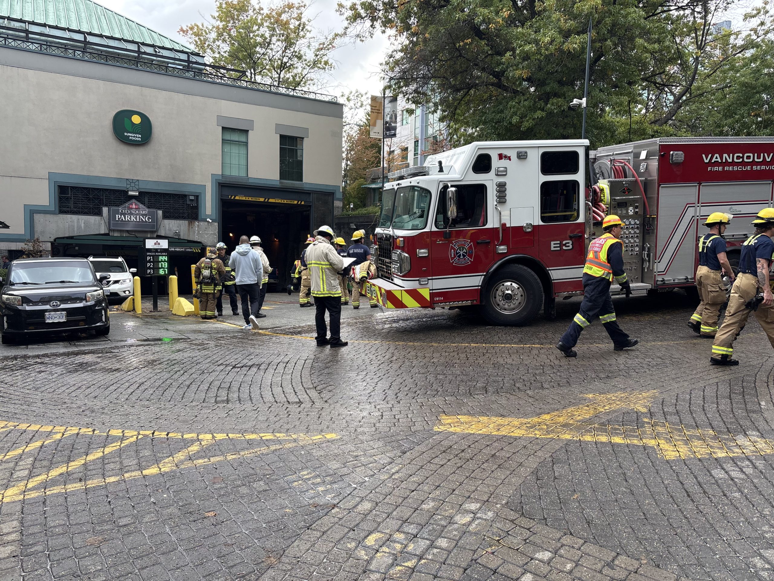 Fire crews had to extinguish a burning vehicle on Friday in the underground parking garage of City Square Mall in Vancouver.